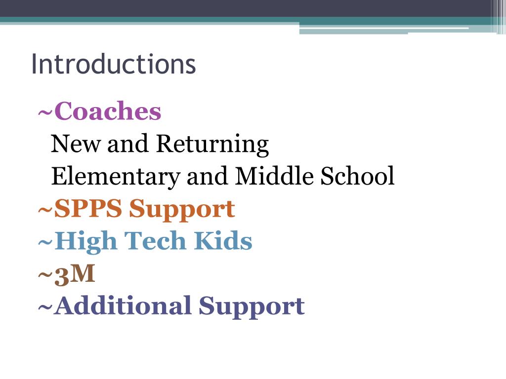 Introductions ~Coaches New and Returning Elementary and Middle School ~SPPS Support ~High Tech Kids ~3M ~Additional Support
