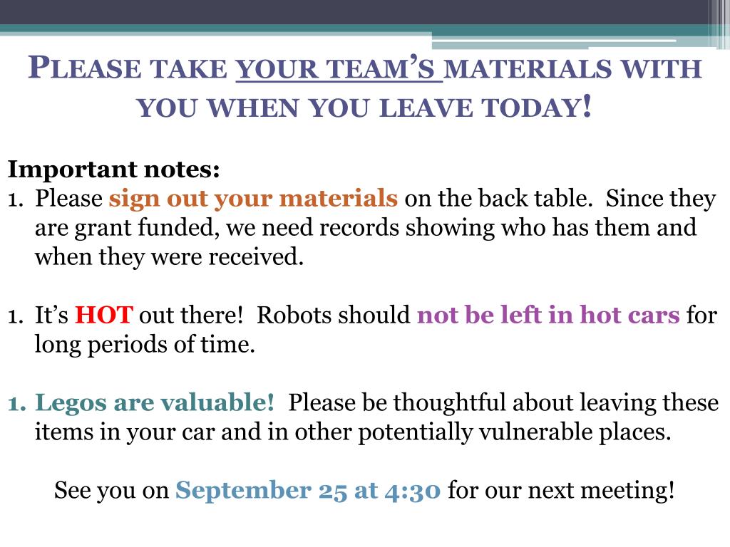 Please take your team’s materials with you when you leave today! Important notes: Please sign out your materials on the back table. Since they are grant funded, we need records showing who has them and when they were received. It’s HOT out there! Robots should not be left in hot cars for long periods of time. Legos are valuable! Please be thoughtful about leaving these items in your car and in other potentially vulnerable places. See you on September 25 at 4:30 for our next meeting!
