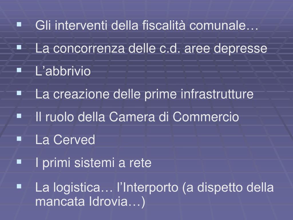 Gli interventi della fiscalità comunale… La concorrenza delle c.d. aree depresse L’abbrivio La creazione delle prime infrastrutture Il ruolo della Camera di Commercio La Cerved I primi sistemi a rete La logistica… l’Interporto (a dispetto della mancata Idrovia…)