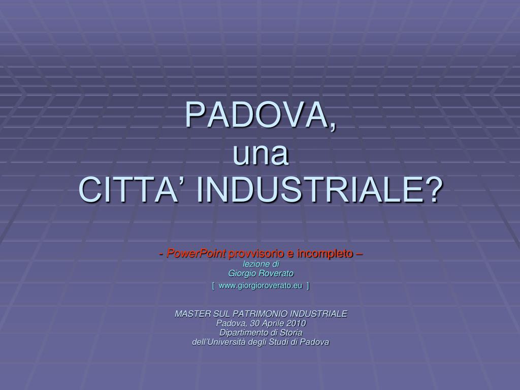 . ZIP PADOVA – FINE ANNI ’90 DEL ‘900. L PADOVA, una CITTA’ INDUSTRIALE? - PowerPoint provvisorio e incompleto – lezione di Giorgio Roverato [ www.giorgioroverato.eu ] MASTER SUL PATRIMONIO INDUSTRIALE Padova, 30 Aprile 2010 Dipartimento di Storia dell’Università degli Studi di Padova.
