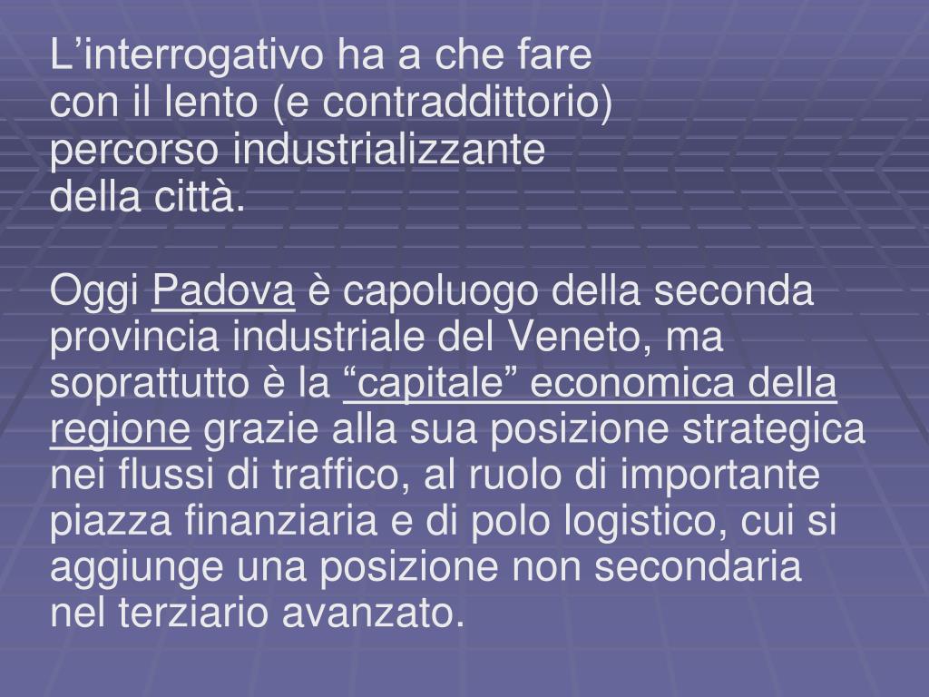 L’interrogativo ha a che fare con il lento (e contraddittorio) percorso industrializzante della città. Oggi Padova è capoluogo della seconda provincia industriale del Veneto, ma soprattutto è la “capitale” economica della regione grazie alla sua posizione strategica nei flussi di traffico, al ruolo di importante piazza finanziaria e di polo logistico, cui si aggiunge una posizione non secondaria nel terziario avanzato.