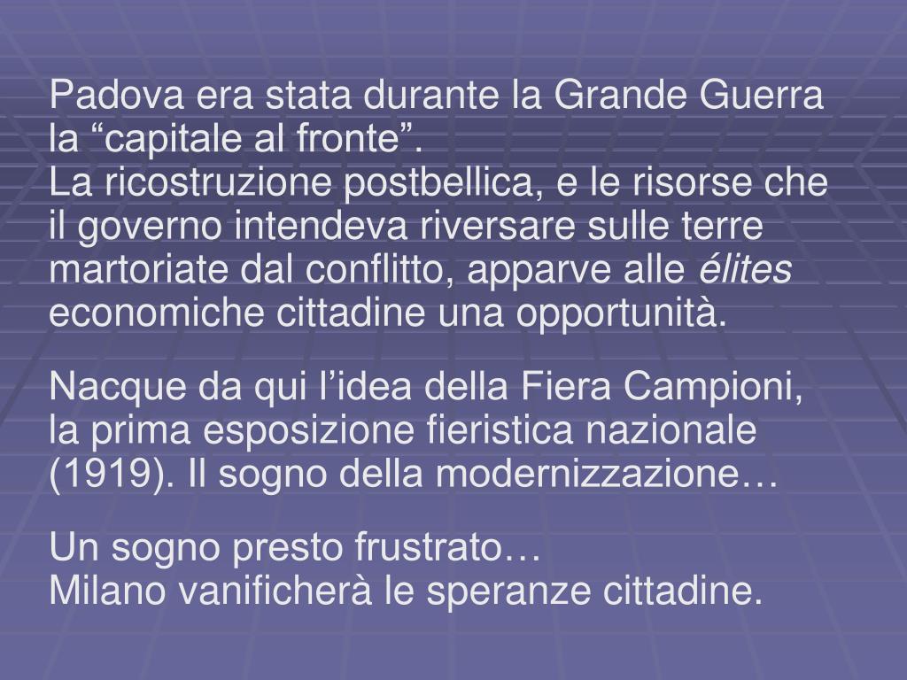 Padova era stata durante la Grande Guerra la “capitale al fronte”. La ricostruzione postbellica, e le risorse che il governo intendeva riversare sulle terre martoriate dal conflitto, apparve alle élites economiche cittadine una opportunità. Nacque da qui l’idea della Fiera Campioni, la prima esposizione fieristica nazionale (1919). Il sogno della modernizzazione… Un sogno presto frustrato… Milano vanificherà le speranze cittadine.