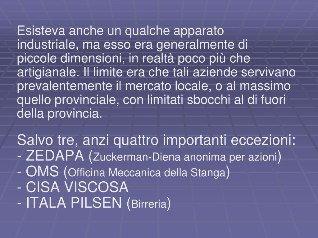 Esisteva anche un qualche apparato industriale, ma esso era generalmente di piccole dimensioni, in realtà poco più che artigianale. Il limite era che tali aziende servivano prevalentemente il mercato locale, o al massimo quello provinciale, con limitati sbocchi al di fuori della provincia. Salvo tre, anzi quattro importanti eccezioni: - ZEDAPA (Zuckerman-Diena anonima per azioni) - OMS (Officina Meccanica della Stanga) - CISA VISCOSA - ITALA PILSEN (Birreria)