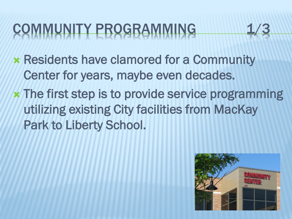 Residents have clamored for a Community Center for years, maybe even decades. The first step is to provide service programming utilizing existing City facilities from MacKay Park to Liberty School. Community Programming 1/3