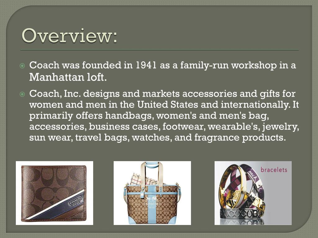 By: Jennifer Spinka. Overview: . Coach was founded in 1941 as a family-run workshop in a Manhattan loft.