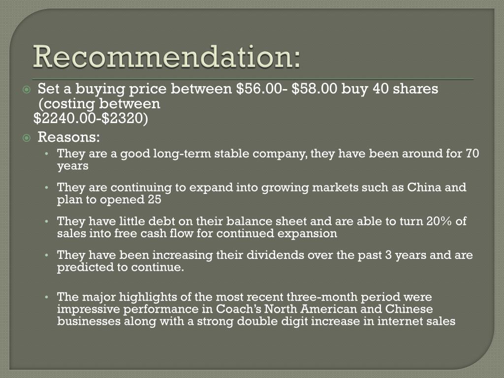 Recommendation: • Set a buying price between $56.00- $58.00 buy 40 shares (costing between $2240.00-$2320) • Reasons: • They are a good long-term stable company, they have been around for 70 years • They are continuing to expand into growing markets such as China and plan to opened 25 • They have little debt on their balance sheet and are able to turn 20% of sales into free cash flow for continued expansion • They have been increasing their dividends over the past 3 years and are predicted to continue. • The major highlights of the most recent three-month period were impressive performance in Coach’s North American and Chinese businesses along with a strong double digit increase in internet sales