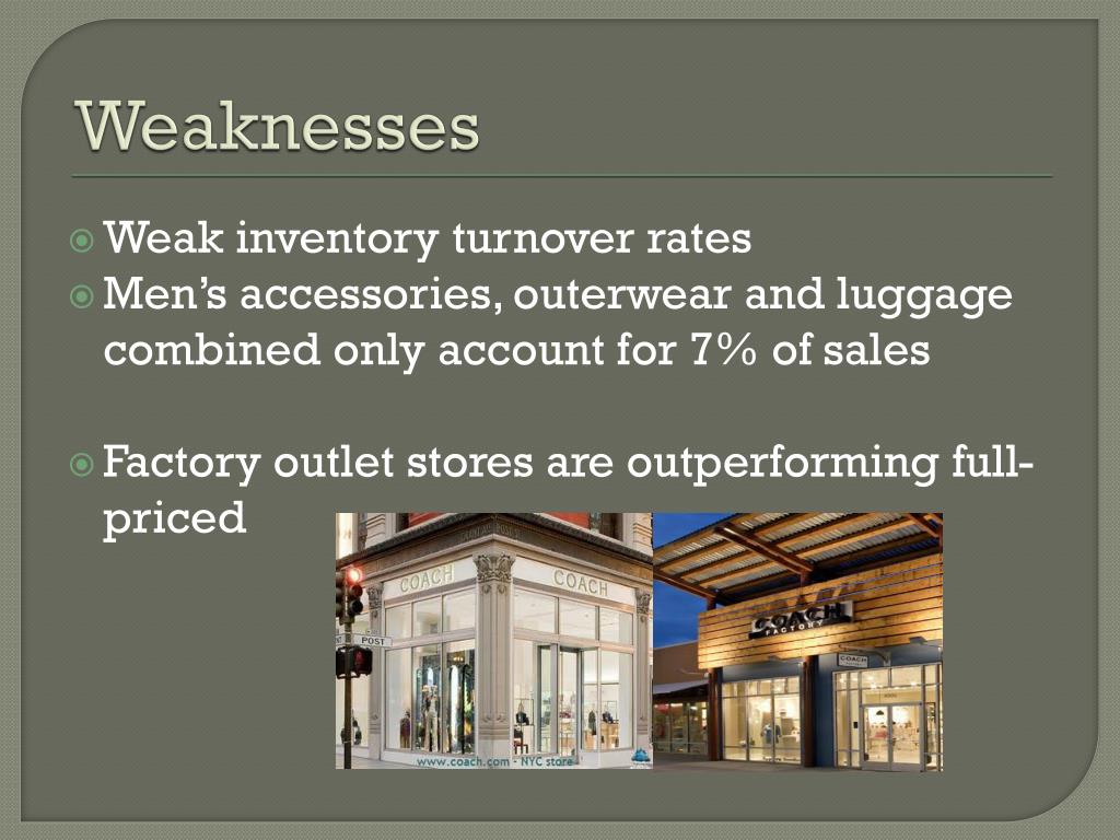 Weaknesses Weak inventory turnover rates Men’s accessories, outerwear and luggage combined only account for 7% of sales Factory outlet stores are outperforming full-priced