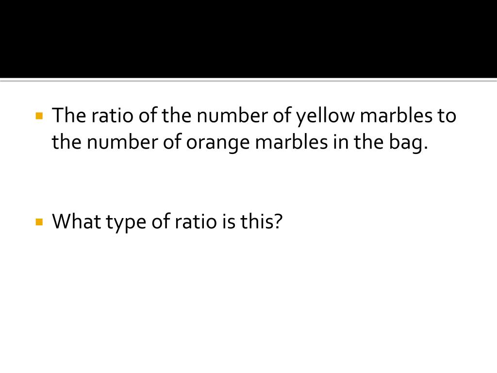 The ratio of the number of yellow marbles to the number of orange marbles in the bag. • What type of ratio is this?