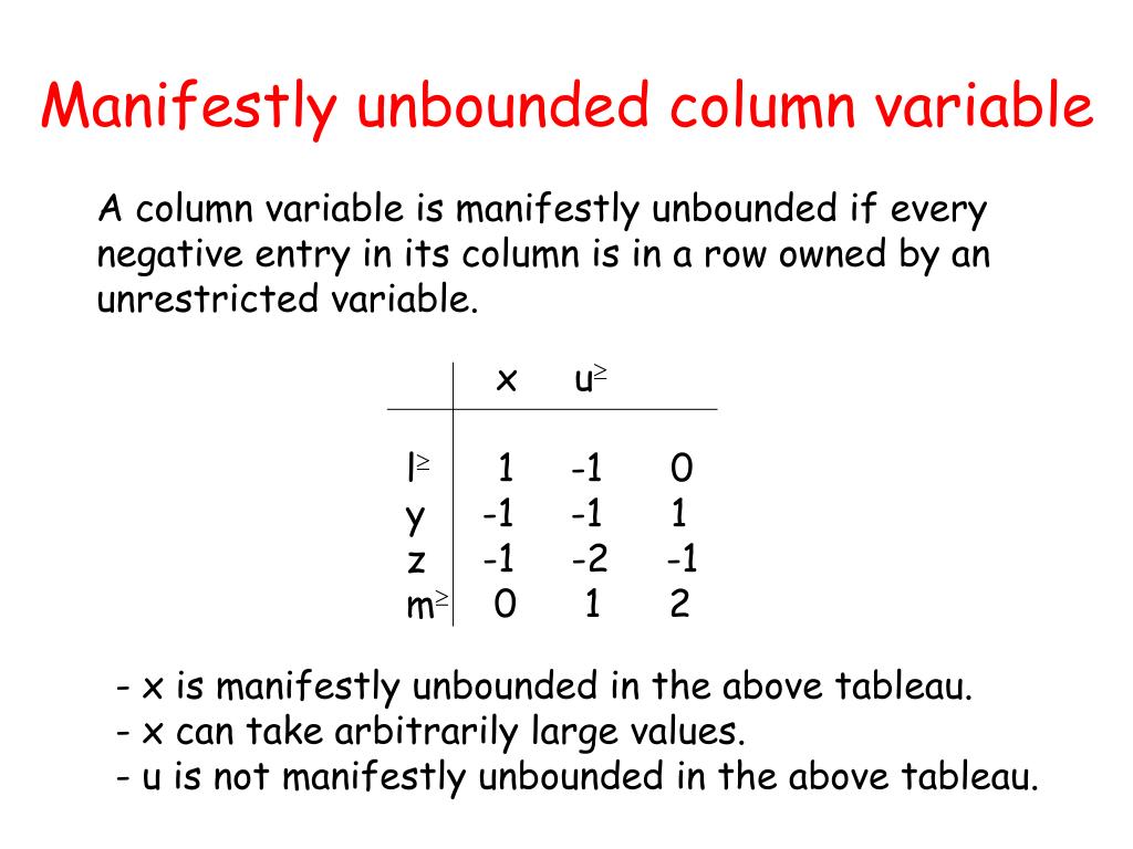 Manifestly unbounded column variable A column variable is manifestly unbounded if every negative entry in its column is in a row owned by an unrestricted variable. x u l 1 -1 0 y -1 -1 1 z -1 -2 -1 m 0 1 2 • x is manifestly unbounded in the above tableau. • x can take arbitrarily large values. • u is not manifestly unbounded in the above tableau.