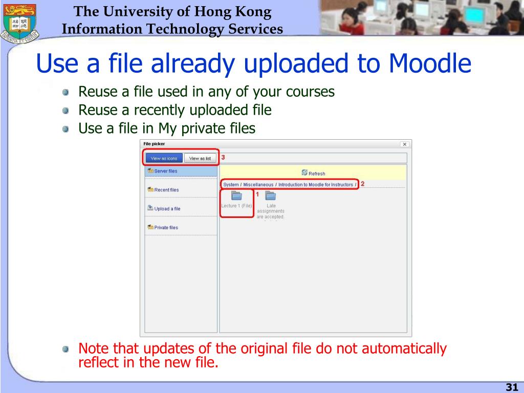 Use a file already uploaded to Moodle • Reuse a file used in any of your courses • Reuse a recently uploaded file • Use a file in My private files • Note that updates of the original file do not automatically reflect in the new file.