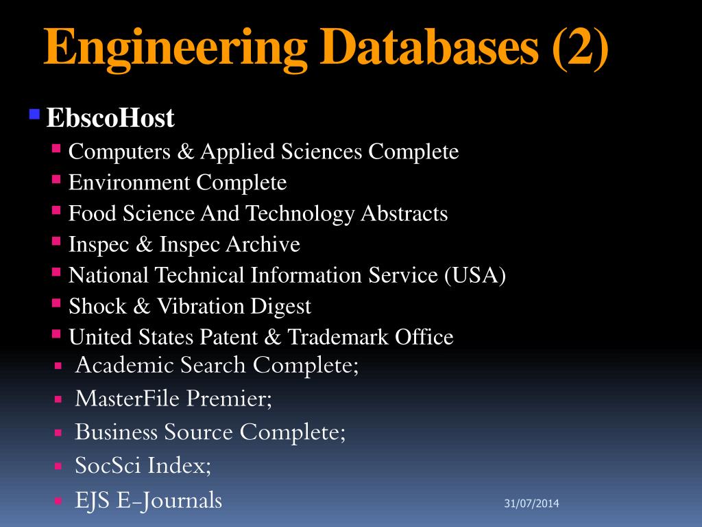 Engineering Databases (2) EbscoHost Computers & Applied Sciences Complete Environment Complete Food Science And Technology Abstracts Inspec & Inspec Archive National Technical Information Service (USA) Shock & Vibration Digest United States Patent & Trademark Office Academic Search Complete; MasterFile Premier; Business Source Complete; SocSci Index; EJS E-Journals