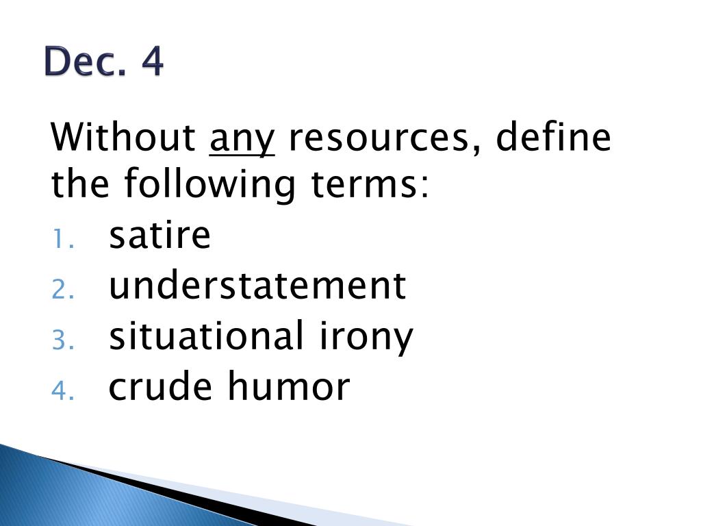 Dec. 4 Without any resources, define the following terms: • satire • understatement • situational irony • crude humor