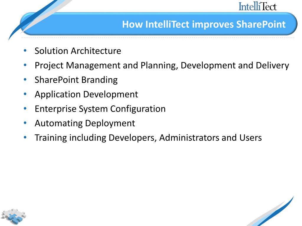 How IntelliTect improves SharePoint • Solution Architecture • Project Management and Planning, Development and Delivery • SharePoint Branding • Application Development • Enterprise System Configuration • Automating Deployment • Training including Developers, Administrators and Users