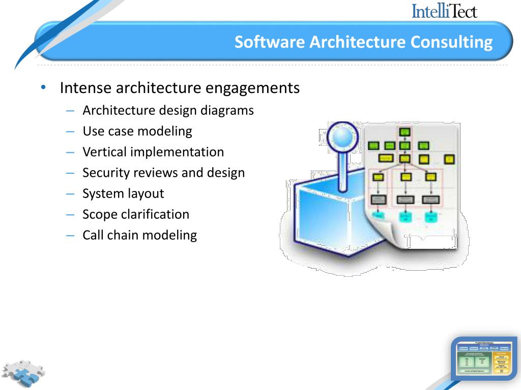 Software Architecture Consulting • Intense architecture engagements • Architecture design diagrams • Use case modeling • Vertical implementation • Security reviews and design • System layout • Scope clarification • Call chain modeling