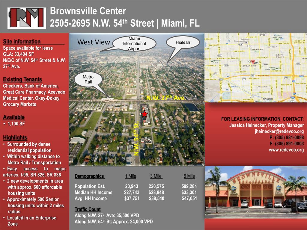 Brownsville Center 2505-2695 N.W. 54th Street | Miami, FL • Site Information • Space available for lease • GLA: 33,404 SF • N/E/C of N.W. 54th Street & N.W. 27th Ave. • Existing Tenants • Checkers, Bank of America, Great Care Pharmacy, Acevedo Medical Center, Okey-Dokey Grocery Markets • Available • 1,100 SF • Highlights • Surrounded by dense • residential population • Within walking distance to • Metro Rail / Transportation • Easy access to major arteries: I-95, SR 826, SR 836 • 2 new developments in area • with approx. 600 affordable • housing units • Approximately 500 Senior • housing units within 2 miles • radius • Located in an Enterprise • Zone West View Miami International Airport Hialeah Metro Rail N.W. 27th Ave. FOR LEASING INFORMATION, CONTACT: Jessica Heinecker, Property Manager jheinecker@redevco.org P: (305) 981-0888 F: (305) 891-0003 www.redevco.org N.W. 54th St. Demographics 1 Mile3 Mile 5 Mile Population Est. 20,943 220,575 599,284 Median HH Income $27,743 $28,848 $33,301 Avg. HH Income $37,751 $38,540 $47,051 Traffic Count Along N.W. 27th Ave: 35,500 VPD Along N.W. 54th St: Approx. 24,000 VPD