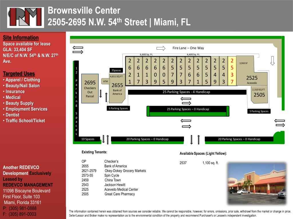 Brownsville Center 2505-2695 N.W. 54th Street | Miami, FL • Site Information • Space available for lease • GLA: 33,404 SF • N/E/C of N.W. 54th & N.W. 27th Ave. • Targeted Uses • Apparel / Clothing • Beauty/Nail Salon • Insurance • Medical • Beauty Supply • Employment Services • Dentist • Traffic School/Ticket • Another REDEVCO Development Exclusively Leased by • REDEVCO MANAGEMENT • 11098 Biscayne Boulevard • First Floor, Suite 103 • Miami, Florida 33161 • P: (305) 981-0888 • F: (305) 891-0003