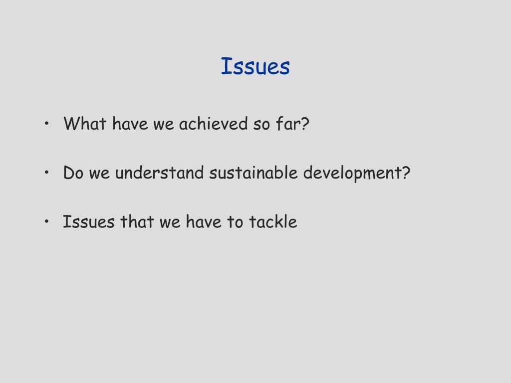 Issues • What have we achieved so far? • Do we understand sustainable development? • Issues that we have to tackle