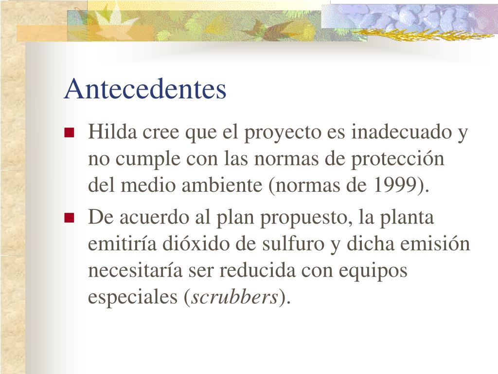 Antecedentes Hilda cree que el proyecto es inadecuado y no cumple con las normas de protección del medio ambiente (normas de 1999). De acuerdo al plan propuesto, la planta emitiría dióxido de sulfuro y dicha emisión necesitaría ser reducida con equipos especiales (scrubbers).