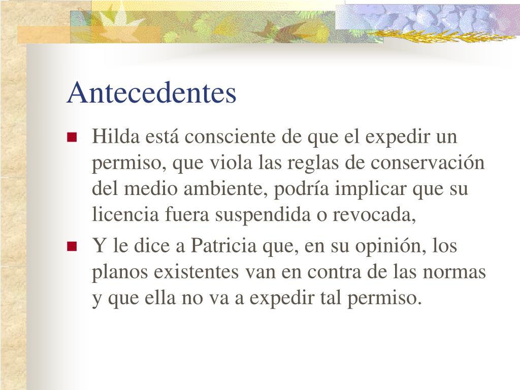 Antecedentes Hilda está consciente de que el expedir un permiso, que viola las reglas de conservación del medio ambiente, podría implicar que su licencia fuera suspendida o revocada, Y le dice a Patricia que, en su opinión, los planos existentes van en contra de las normas y que ella no va a expedir tal permiso.