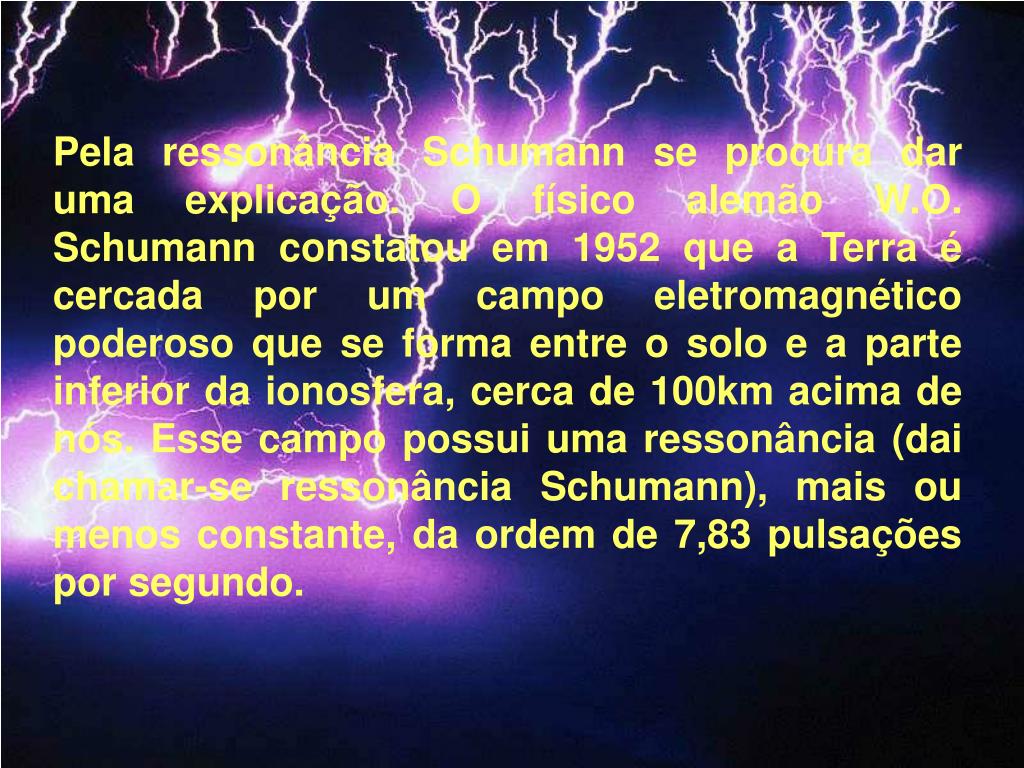 Pela ressonância Schumann se procura dar uma explicação. O físico alemão W.O. Schumann constatou em 1952 que a Terra é cercada por um campo eletromagnético poderoso que se forma entre o solo e a parte inferior da ionosfera, cerca de 100km acima de nós. Esse campo possui uma ressonância (dai chamar-se ressonância Schumann), mais ou menos constante, da ordem de 7,83 pulsações por segundo.