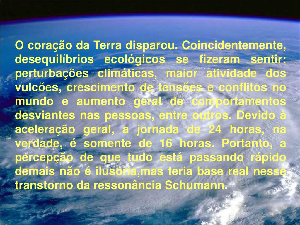 O coração da Terra disparou. Coincidentemente, desequilíbrios ecológicos se fizeram sentir: perturbações climáticas, maior atividade dos vulcões, crescimento de tensões e conflitos no mundo e aumento geral de comportamentos desviantes nas pessoas, entre outros. Devido à aceleração geral, a jornada de 24 horas, na verdade, é somente de 16 horas. Portanto, a percepção de que tudo está passando rápido demais não é ilusória,mas teria base real nesse transtorno da ressonância Schumann.
