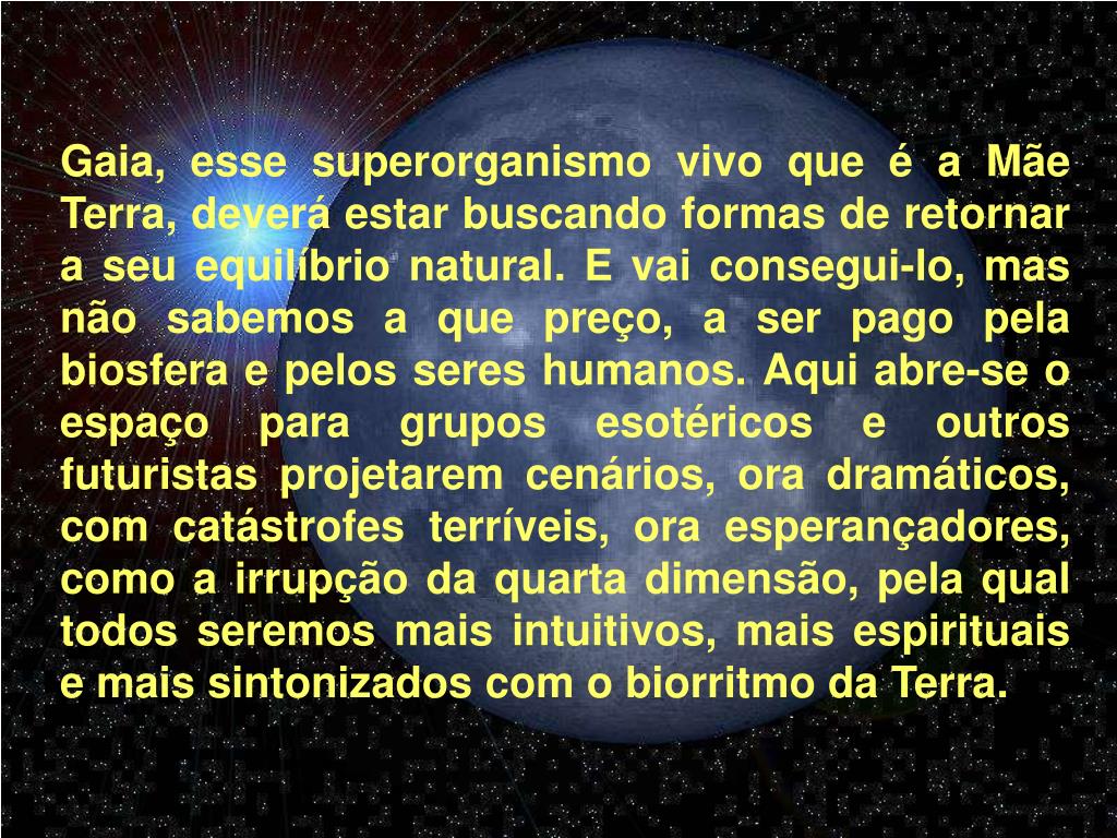 Gaia, esse superorganismo vivo que é a Mãe Terra, deverá estar buscando formas de retornar a seu equilíbrio natural. E vai consegui-lo, mas não sabemos a que preço, a ser pago pela biosfera e pelos seres humanos. Aqui abre-se o espaço para grupos esotéricos e outros futuristas projetarem cenários, ora dramáticos, com catástrofes terríveis, ora esperançadores, como a irrupção da quarta dimensão, pela qual todos seremos mais intuitivos, mais espirituais e mais sintonizados com o biorritmo da Terra.
