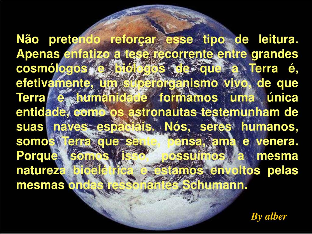 Não pretendo reforçar esse tipo de leitura. Apenas enfatizo a tese recorrente entre grandes cosmólogos e biólogos de que a Terra é, efetivamente, um superorganismo vivo, de que Terra e humanidade formamos uma única entidade, como os astronautas testemunham de suas naves espaciais. Nós, seres humanos, somos Terra que sente, pensa, ama e venera. Porque somos isso, possuímos a mesma natureza bioelétrica e estamos envoltos pelas mesmas ondas ressonantes Schumann. By alber