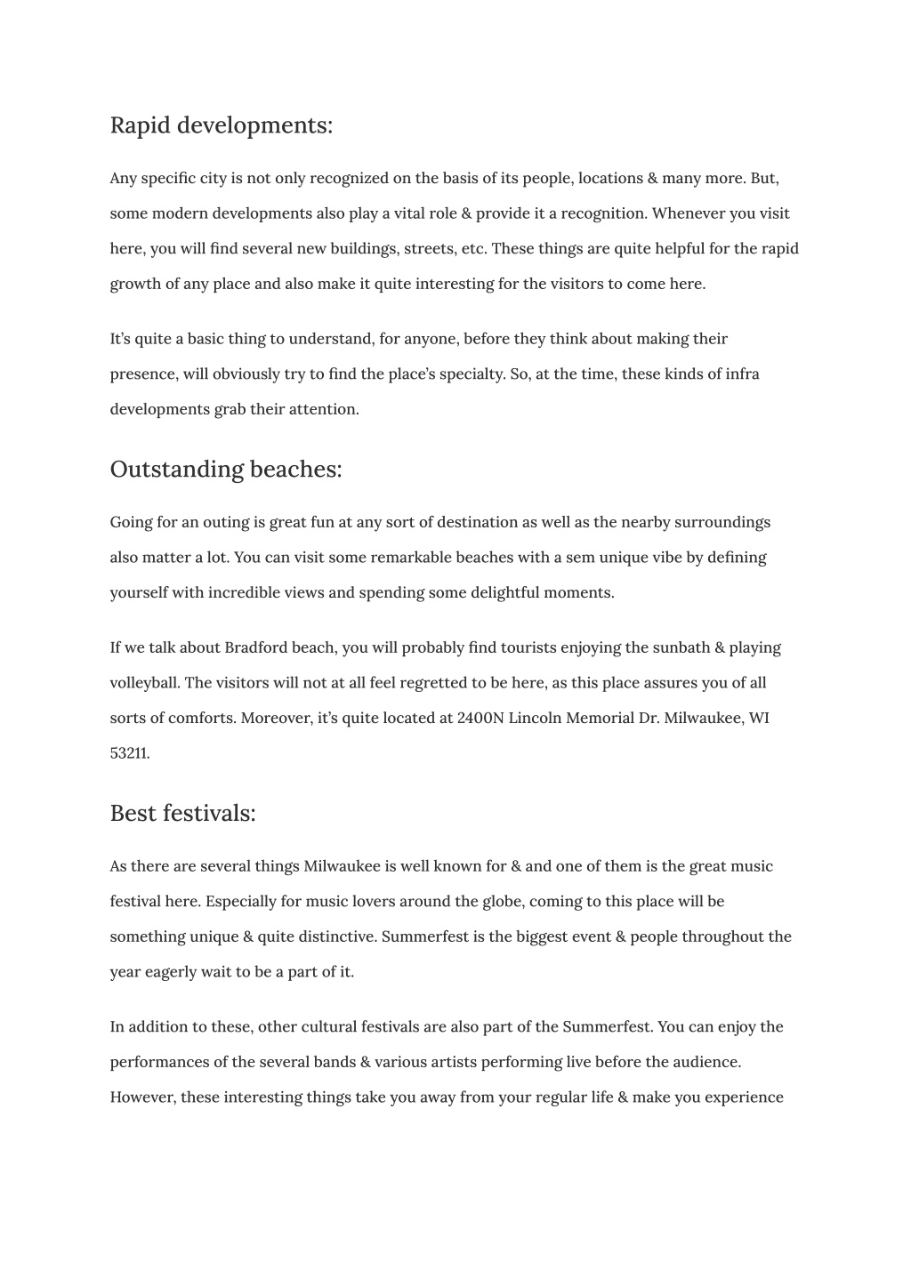 Rapid developments: Any specific city is not only recognized on the basis of its people, locations & many more. But, some modern developments also play a vital role & provide it a recognition. Whenever you visit here, you will find several new buildings, streets, etc. These things are quite helpful for the rapid growth of any place and also make it quite interesting for the visitors to come here. It’s quite a basic thing to understand, for anyone, before they think about making their presence, will obviously try to find the place’s specialty. So, at the time, these kinds of infra developments grab their attention. Outstanding beaches: Going for an outing is great fun at any sort of destination as well as the nearby surroundings also matter a lot. You can visit some remarkable beaches with a sem unique vibe by defining yourself with incredible views and spending some delightful moments. If we talk about Bradford beach, you will probably find tourists enjoying the sunbath & playing volleyball. The visitors will not at all feel regretted to be here, as this place assures you of all sorts of comforts. Moreover, it’s quite located at 2400N Lincoln Memorial Dr. Milwaukee, WI 53211. Best festivals: As there are several things Milwaukee is well known for & and one of them is the great music festival here. Especially for music lovers around the globe, coming to this place will be something unique & quite distinctive. Summerfest is the biggest event & people throughout the year eagerly wait to be a part of it. In addition to these, other cultural festivals are also part of the Summerfest. You can enjoy the performances of the several bands & various artists performing live before the audience. However, these interesting things take you away from your regular life & make you experience