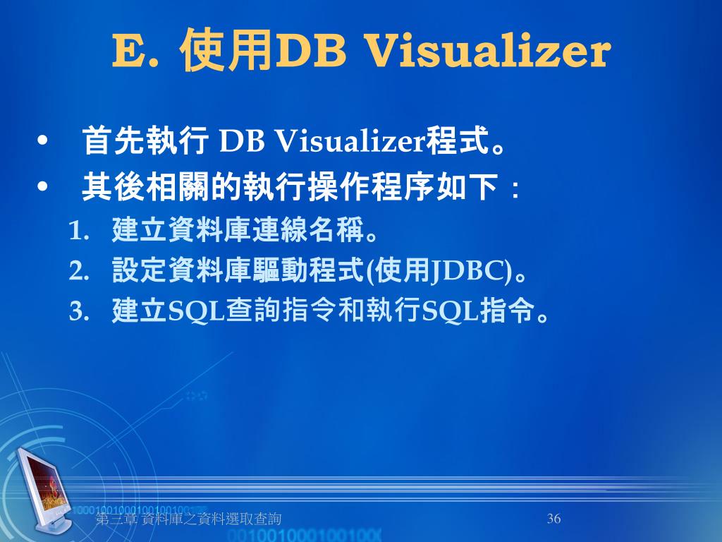 E. 使用DB Visualizer • 首先執行 DB Visualizer程式。 • 其後相關的執行操作程序如下: • 建立資料庫連線名稱。 • 設定資料庫驅動程式(使用JDBC)。 • 建立SQL查詢指令和執行SQL指令。