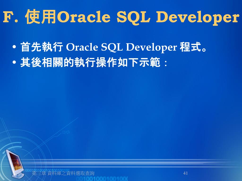 F. 使用Oracle SQL Developer • 首先執行 Oracle SQL Developer 程式。 • 其後相關的執行操作如下示範: