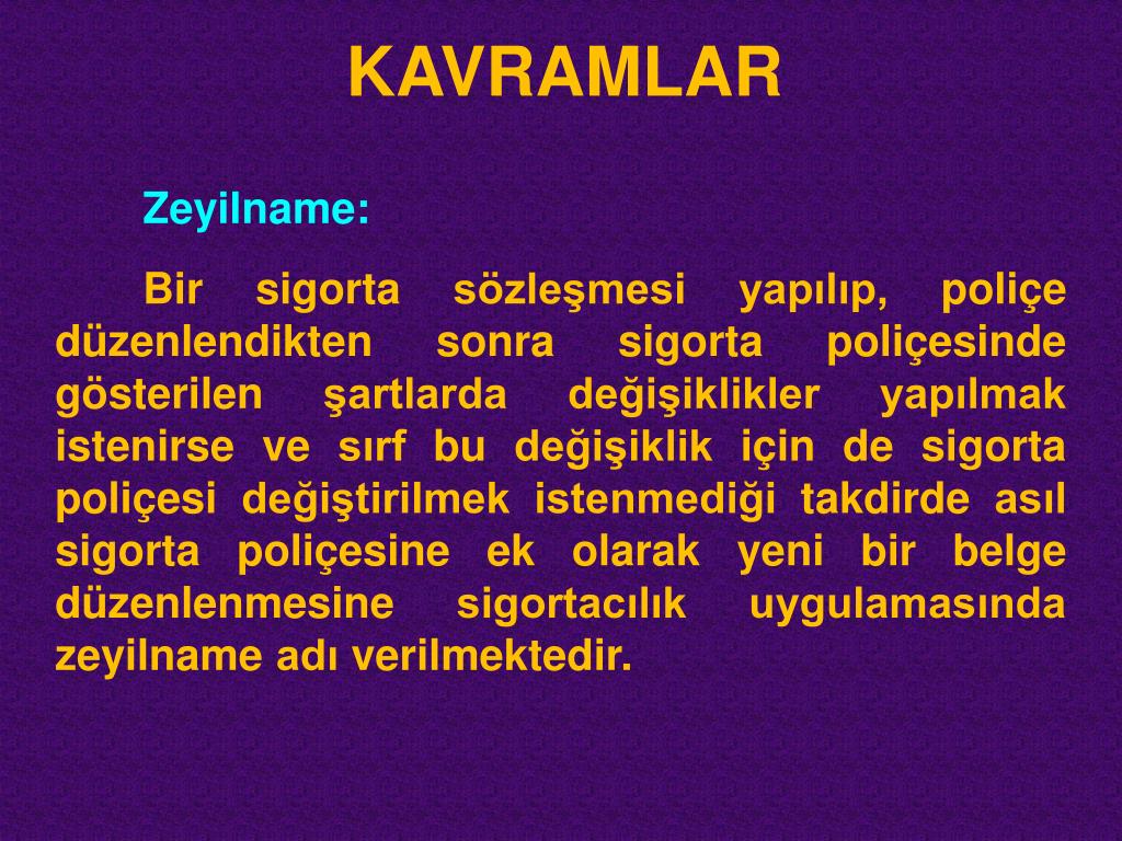 KAVRAMLAR Zeyilname: Bir sigorta sözleşmesi yapılıp, poliçe düzenlendikten sonra sigorta poliçesinde gösterilen şartlarda değişiklikler yapılmak istenirse ve sırf bu değişiklik için de sigorta poliçesi değiştirilmek istenmediği takdirde asıl sigorta poliçesine ek olarak yeni bir belge düzenlenmesine sigortacılık uygulamasında zeyilname adı verilmektedir.