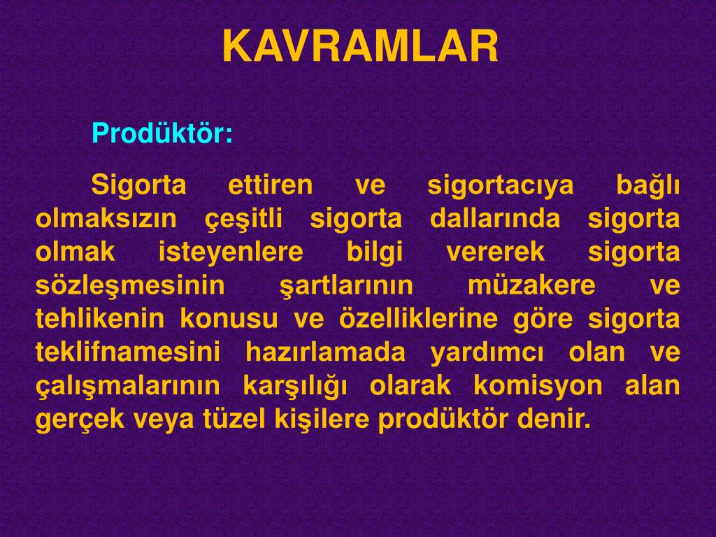 KAVRAMLAR Prodüktör: Sigorta ettiren ve sigortacıya bağlı olmaksızın çeşitli sigorta dallarında sigorta olmak isteyenlere bilgi vererek sigorta sözleşmesinin şartlarının müzakere ve tehlikenin konusu ve özelliklerine göre sigorta teklifnamesini hazırlamada yardımcı olan ve çalışmalarının karşılığı olarak komisyon alan gerçek veya tüzel kişilere prodüktör denir.