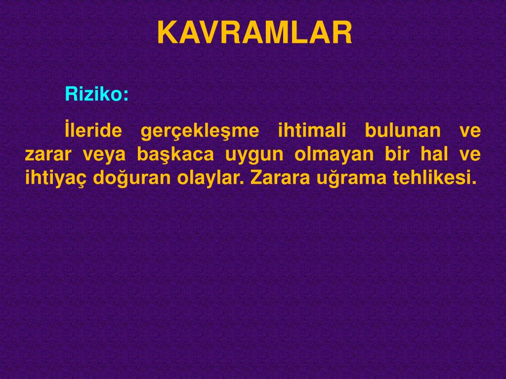 KAVRAMLAR Riziko: İleride gerçekleşme ihtimali bulunan ve zarar veya başkaca uygun olmayan bir hal ve ihtiyaç doğuran olaylar. Zarara uğrama tehlikesi.