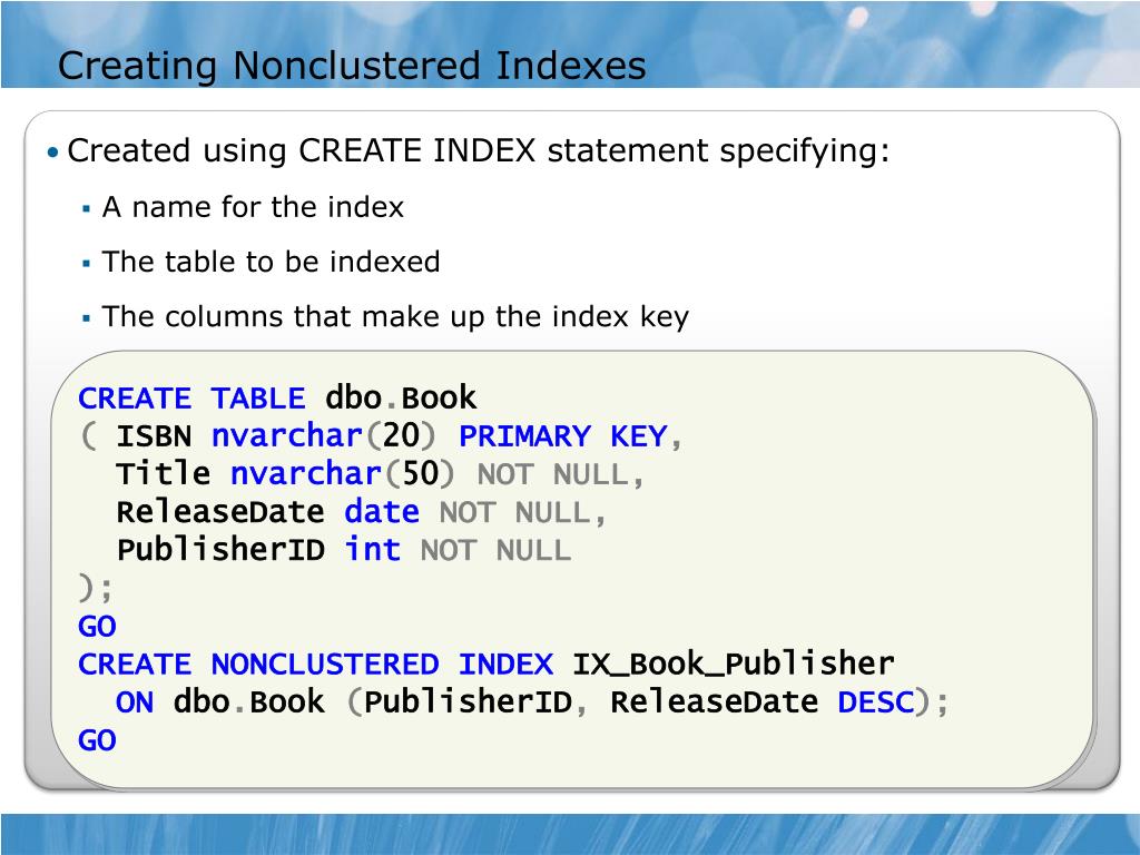 Creating Nonclustered Indexes • Created using CREATE INDEX statement specifying: • A name for the index • The table to be indexed • The columns that make up the index key CREATETABLEdbo.Book ( ISBN nvarchar(20)PRIMARYKEY, Title nvarchar(50)NOTNULL, ReleaseDatedateNOTNULL, PublisherIDintNOTNULL ); GO CREATENONCLUSTEREDINDEXIX_Book_Publisher ONdbo.Book(PublisherID,ReleaseDateDESC); GO