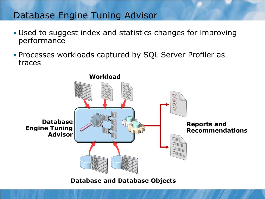 Database Engine Tuning Advisor • Used to suggest index and statistics changes for improving performance • Processes workloads captured by SQL Server Profiler as traces Workload Database Engine Tuning Advisor Reports and Recommendations Database and Database Objects