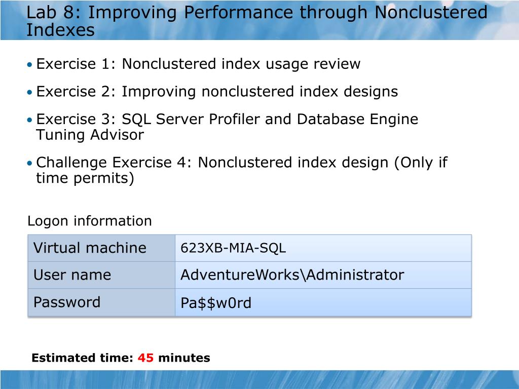 Lab 8: Improving Performance through Nonclustered Indexes • Exercise 1: Nonclustered index usage review • Exercise 2: Improving nonclustered index designs • Exercise 3: SQL Server Profiler and Database Engine Tuning Advisor • Challenge Exercise 4: Nonclustered index design (Only if time permits) Logon information Estimated time: 45minutes