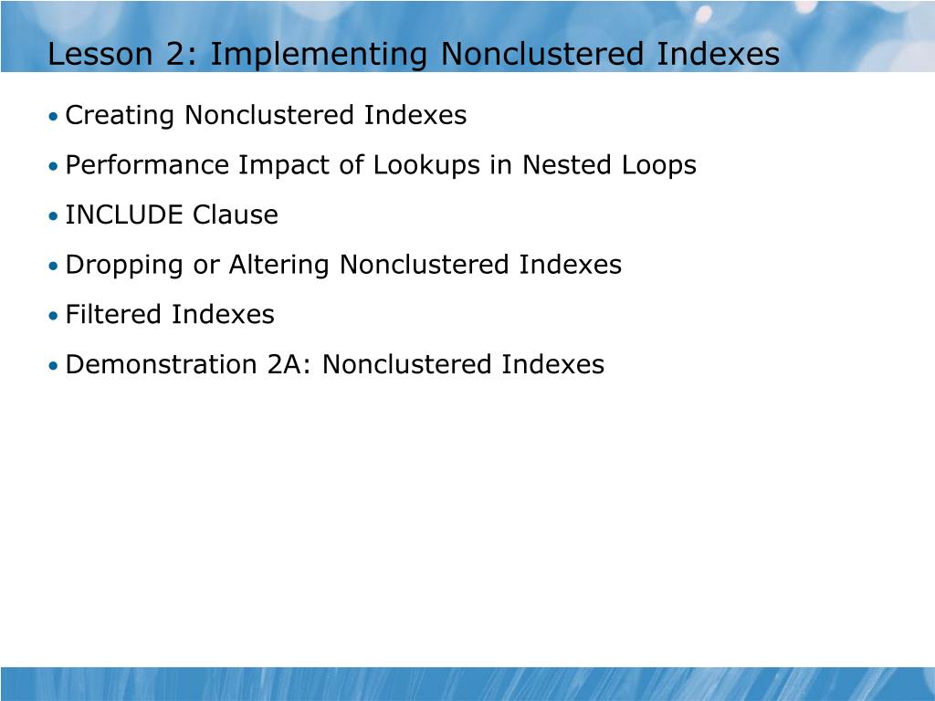 Lesson 2: Implementing Nonclustered Indexes • Creating Nonclustered Indexes • Performance Impact of Lookups in Nested Loops • INCLUDE Clause • Dropping or Altering Nonclustered Indexes • Filtered Indexes • Demonstration 2A: Nonclustered Indexes