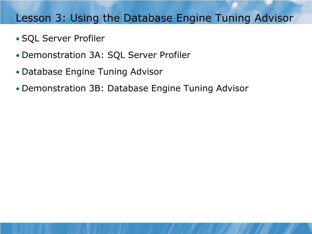 Lesson 3: Using the Database Engine Tuning Advisor • SQL Server Profiler • Demonstration 3A: SQL Server Profiler • Database Engine Tuning Advisor • Demonstration 3B: Database Engine Tuning Advisor
