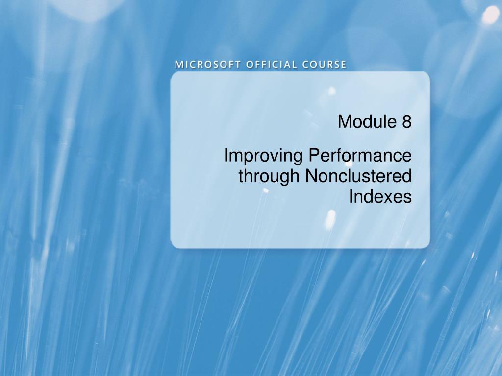 Module 8 Improving Performance through Nonclustered Indexes. Module Overview. Designing Effective Nonclustered Indexes Implementing Nonclustered Indexes Using the Database Engine Tuning Advisor. Lesson 1: Designing Effective Nonclustered Indexes. What is a Nonclustered Index?