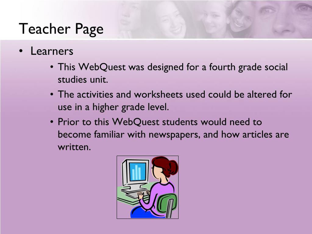 Teacher Page • Learners • This WebQuest was designed for a fourth grade social studies unit. • The activities and worksheets used could be altered for use in a higher grade level. • Prior to this WebQuest students would need to become familiar with newspapers, and how articles are written.