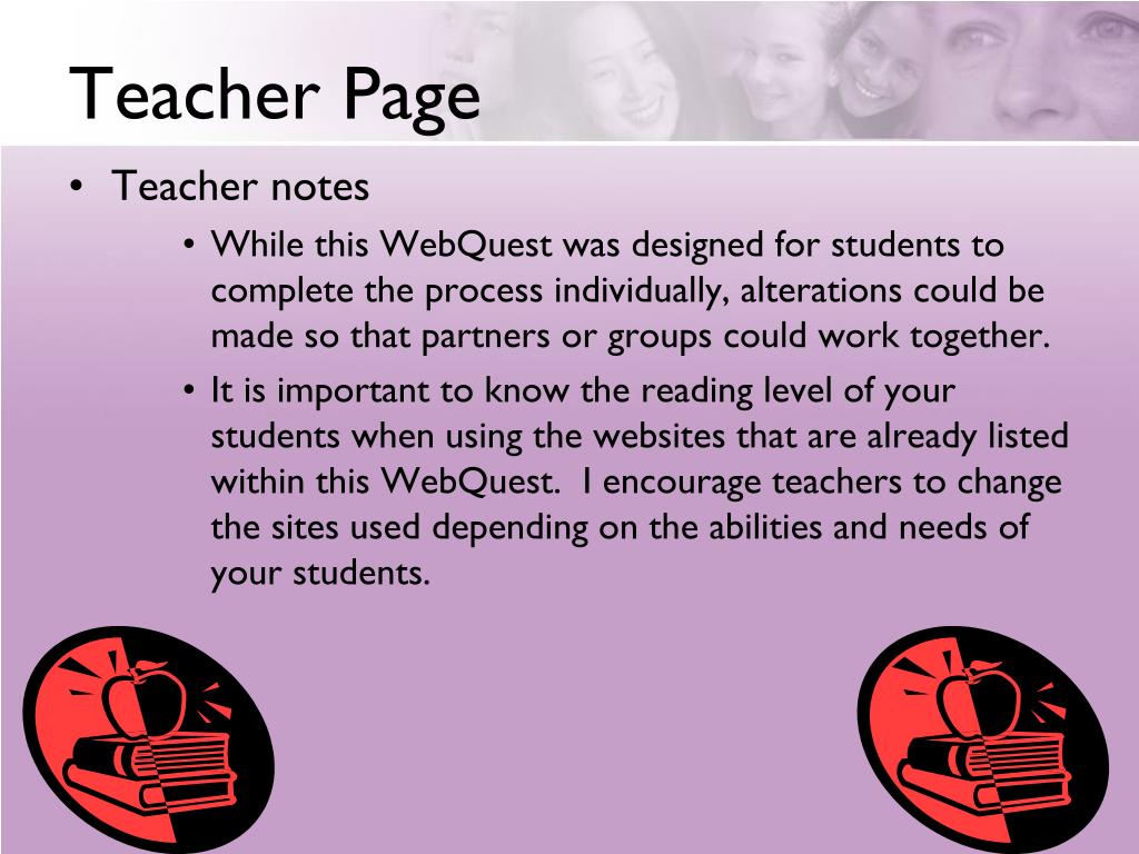 Teacher Page • Teacher notes • While this WebQuest was designed for students to complete the process individually, alterations could be made so that partners or groups could work together. • It is important to know the reading level of your students when using the websites that are already listed within this WebQuest. I encourage teachers to change the sites used depending on the abilities and needs of your students.
