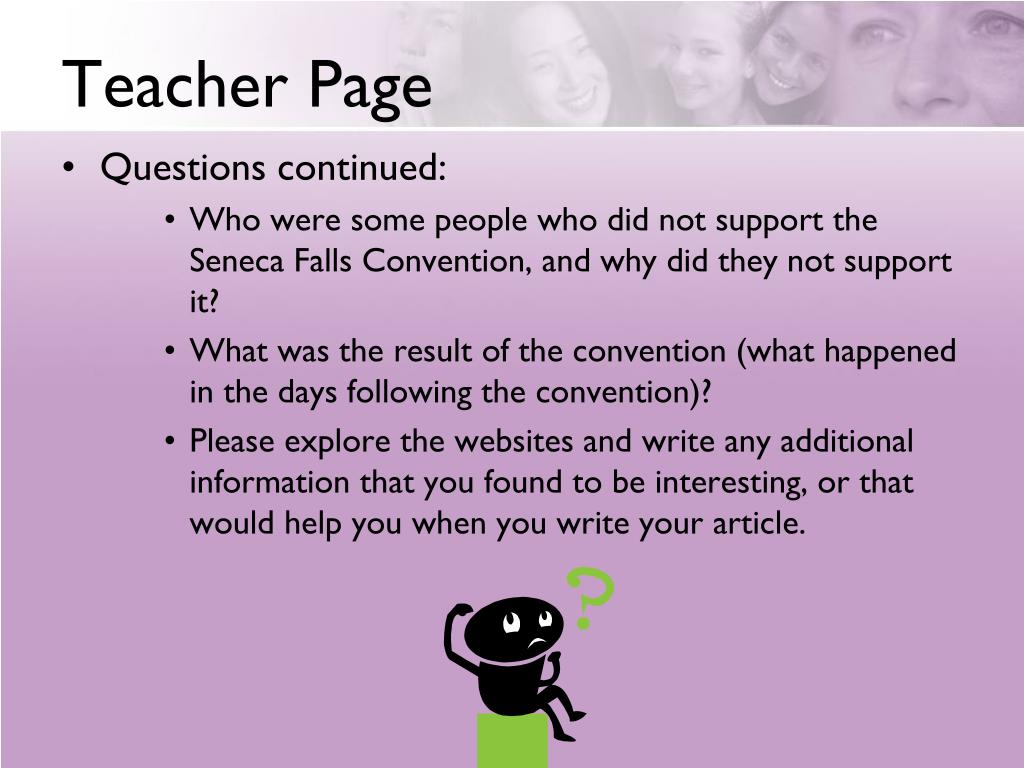 Teacher Page • Questions continued: • Who were some people who did not support the Seneca Falls Convention, and why did they not support it? • What was the result of the convention (what happened in the days following the convention)? • Please explore the websites and write any additional information that you found to be interesting, or that would help you when you write your article.