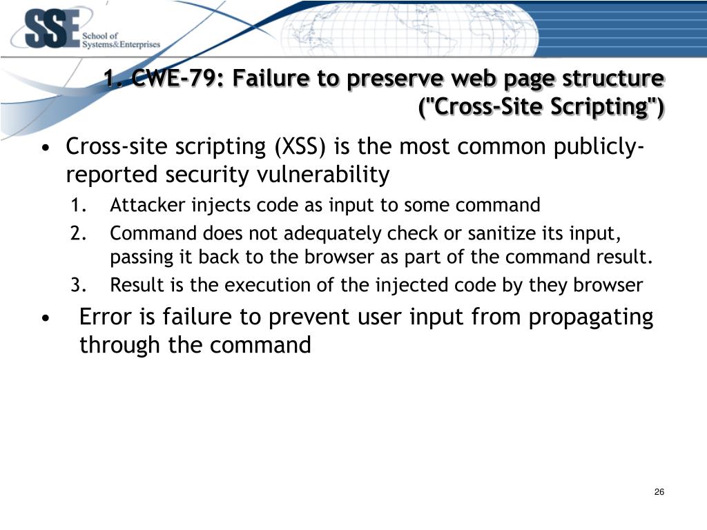 1. CWE-79: Failure to preserve web page structure ("Cross-Site Scripting") • Cross-site scripting (XSS) is the most common publicly-reported security vulnerability • Attacker injects code as input to some command • Command does not adequately check or sanitize its input, passing it back to the browser as part of the command result. • Result is the execution of the injected code by they browser • Error is failure to prevent user input from propagating through the command