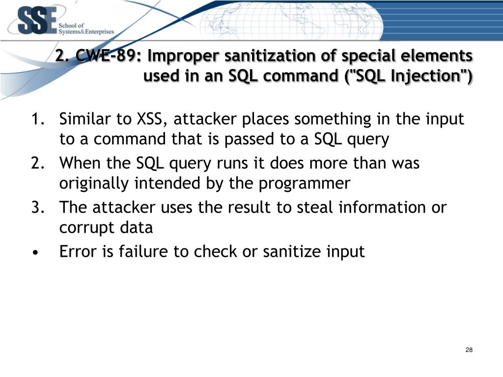 2. CWE-89: Improper sanitization of special elements used in an SQL command ("SQL Injection") Similar to XSS, attacker places something in the input to a command that is passed to a SQL query When the SQL query runs it does more than was originally intended by the programmer The attacker uses the result to steal information or corrupt data Error is failure to check or sanitize input