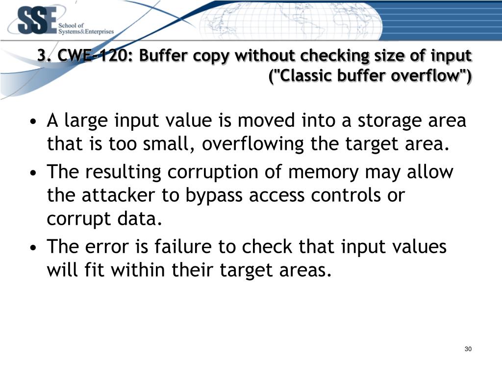 3. CWE-120: Buffer copy without checking size of input ("Classic buffer overflow") A large input value is moved into a storage area that is too small, overflowing the target area. The resulting corruption of memory may allow the attacker to bypass access controls or corrupt data. The error is failure to check that input values will fit within their target areas.