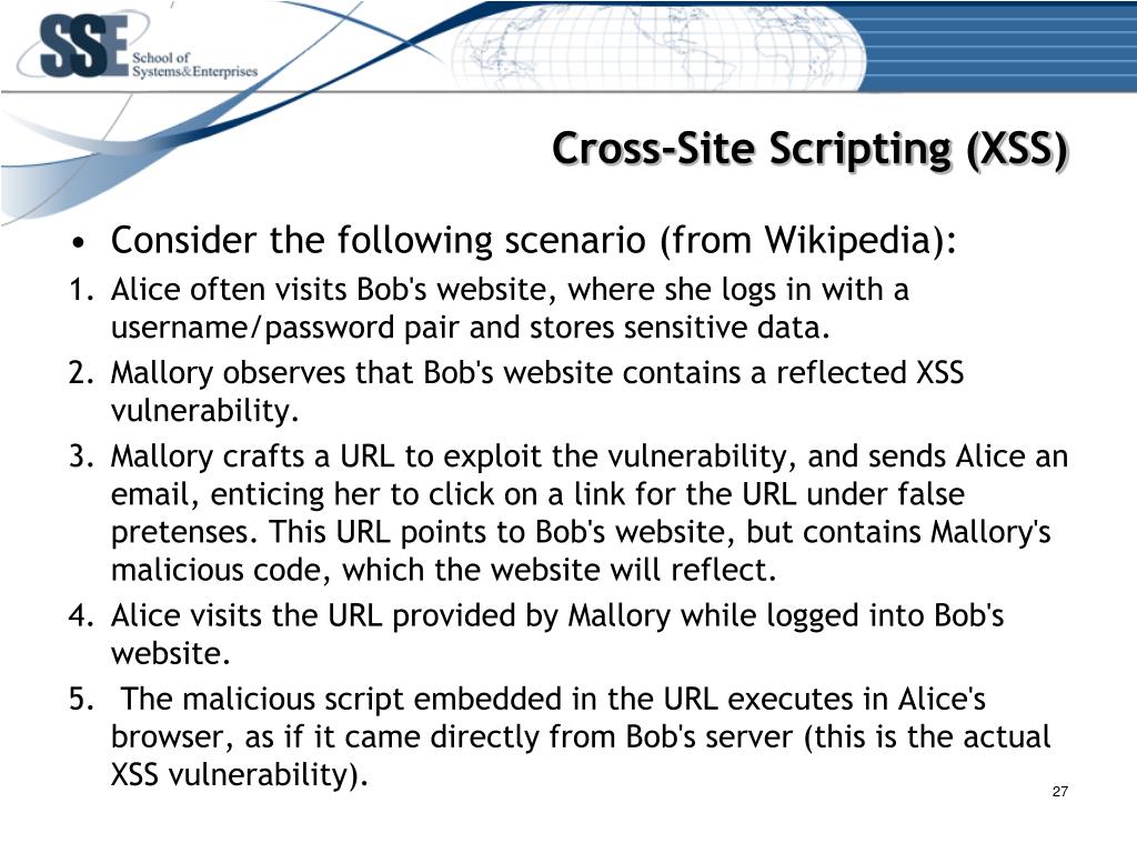 Cross-Site Scripting (XSS) Consider the following scenario (from Wikipedia): Alice often visits Bob's website, where she logs in with a username/password pair and stores sensitive data. Mallory observes that Bob's website contains a reflected XSS vulnerability. Mallory crafts a URL to exploit the vulnerability, and sends Alice an email, enticing her to click on a link for the URL under false pretenses. This URL points to Bob's website, but contains Mallory's malicious code, which the website will reflect. Alice visits the URL provided by Mallory while logged into Bob's website. The malicious script embedded in the URL executes in Alice's browser, as if it came directly from Bob's server (this is the actual XSS vulnerability).