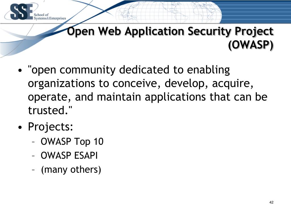 Open Web Application Security Project(OWASP) • "open community dedicated to enabling organizations to conceive, develop, acquire, operate, and maintain applications that can be trusted." • Projects: • OWASP Top 10 • OWASP ESAPI • (many others)