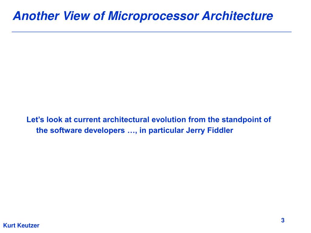 Another View of Microprocessor Architecture • Let’s look at current architectural evolution from the standpoint of the software developers …, in particular Jerry Fiddler Kurt Keutzer