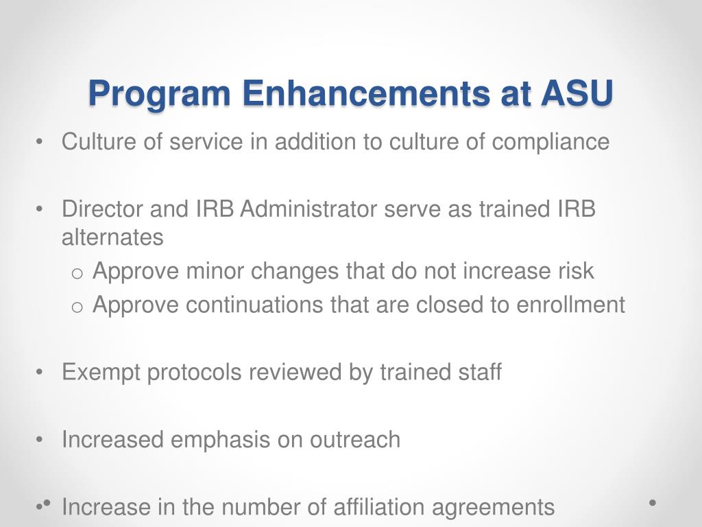Program Enhancements at ASU • Culture of service in addition to culture of compliance • Director and IRB Administrator serve as trained IRB alternates • Approve minor changes that do not increase risk • Approve continuations that are closed to enrollment • Exempt protocols reviewed by trained staff • Increased emphasis on outreach • Increase in the number of affiliation agreements
