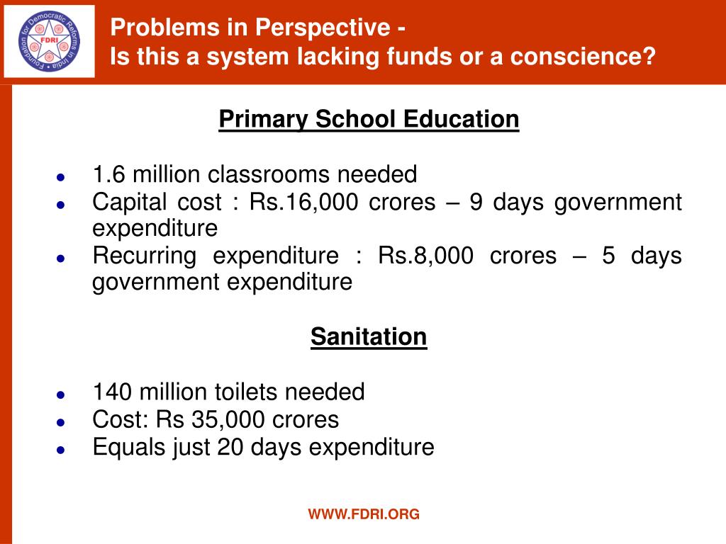 Problems in Perspective - Is this a system lacking funds or a conscience? • Primary School Education • 1.6 million classrooms needed • Capital cost : Rs.16,000 crores – 9 days government expenditure • Recurring expenditure : Rs.8,000 crores – 5 days government expenditure • Sanitation • 140 million toilets needed • Cost: Rs 35,000 crores • Equals just 20 days expenditure WWW.FDRI.ORG